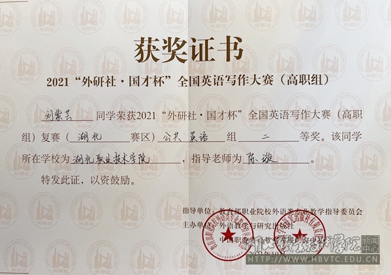 日前,由教育部职业院校外语类专业教学委员会指导、外语教学与研究出版社和中国职业外语教育发展中心主办的全国英语写作大赛(高职组)结果揭晓,我校医学院管晓宁、护理学院刘紫芸同学分别荣获湖北赛区二等奖(公共英语组)。