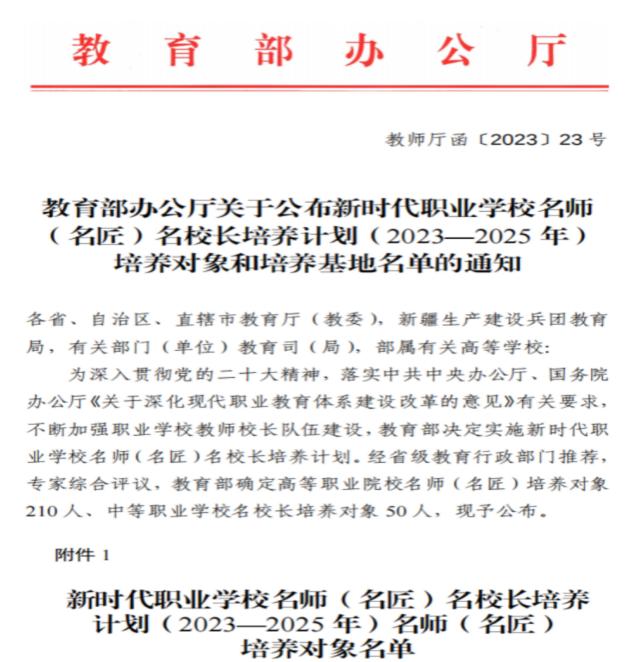 (本网讯 张舟)近日,教育部办公厅公布了新时代职业学校名师(名匠)名校长培养计划(2023-2025年)培养对象和培养基地名单,我校教师黄琼入选教育类名师培养对象。经省级教育行政部门推荐,专家综合评议,教育部确定高等职业院校名师(名匠)培养对象210人、中等职业学校名校长培养对象50人。