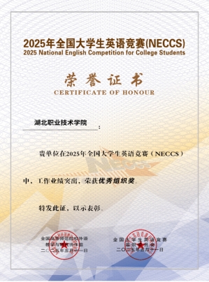 (本网讯 孙秀君 胡巍)近日,2025年全国大学生英语竞赛决赛在华中师范大学落下帷幕,湖北省79所高校400余名学生参加决赛。经过激烈角逐,我校参加决赛的2名同学均获一等奖。在前期的初赛中,8名同学荣获二等奖,13名同学荣获三等奖。此外,我校凭借出色组织工作,荣获“优秀组织奖”。